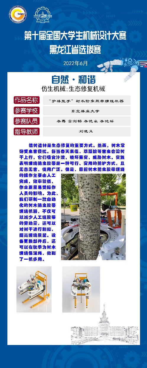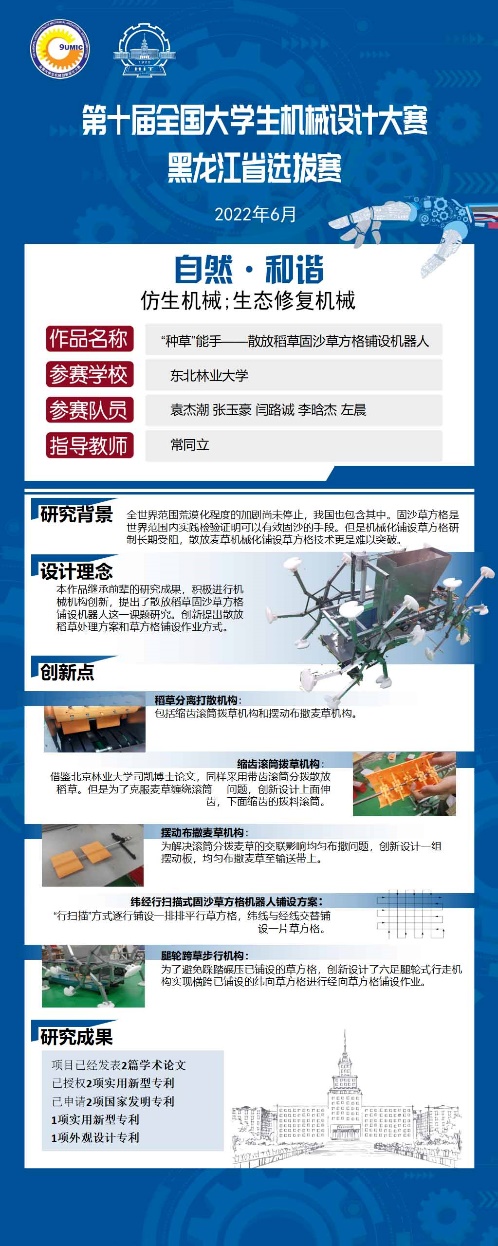 日前,以“自然•和谐”为主题的第十届全国大学生机械创新设计大赛黑龙江赛区决赛落下帷幕。由开云kaiyun官方网站选送的参赛作品《“种草”能手——散放稻草固沙草方格铺设群体协作机器人》《“护林能手”——树木防虫胶带缠绕机器》晋级全国总决赛。