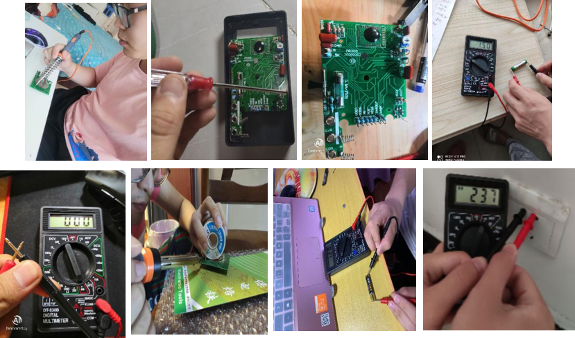 学生在家焊接PC板,调试、测量干电池和插排电压