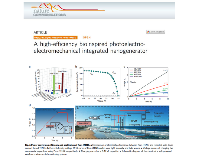 纳米摩擦发电机(TENG)是一种典型的微机电一体化系统,通过收集周围环境中的机械能进行发电,其发电性能提升是当前学者们所瞩目的关键性问题。师法于自然,受植物光合作用的启发,作者提出了一种光电-机电一体化的能量收集系统(Pem-iTENG)通过收集太阳能与潮汐能进行发电,并且作者为Pem-iTENG表面穿上荷叶表面超疏水自清洁的外衣。这种能量系统(Pem-iTENG)的开路电压可达124.2 V,短路电流密度可达221.6μAcm-2,获得了高效的功率转化效率。基于提出的Pem-iTENG,作者设计了一种自供电无线环境监控系统,可远程服务于海洋、户外等作业环境。这种能量收集技术对于未来海洋工况环境发电提供了重要的技术支撑。