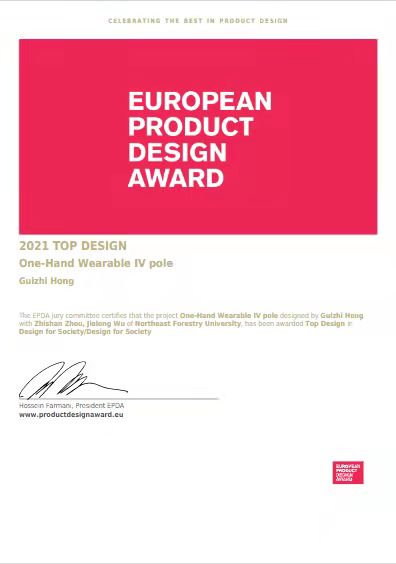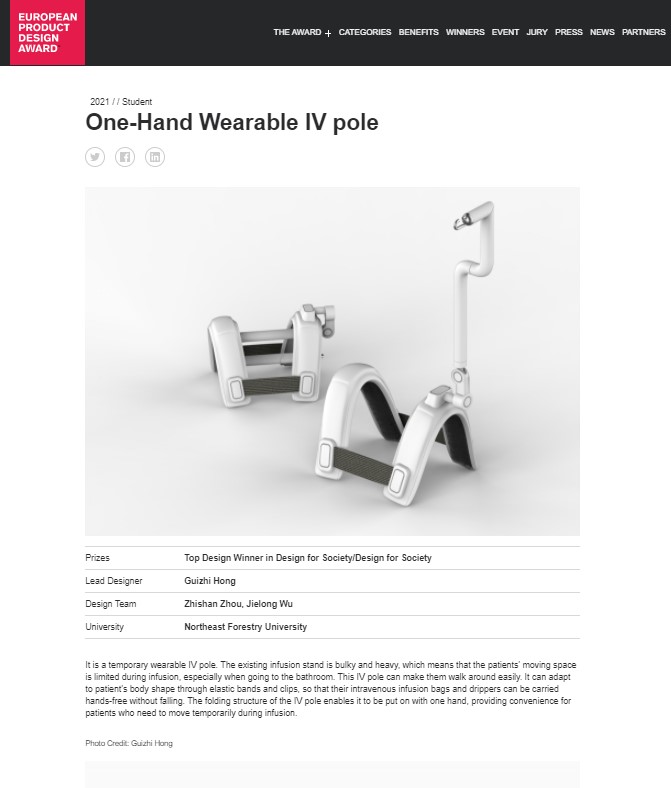 日前,2021年度欧洲产品设计奖(European Product Design Award™)新鲜出炉,由我院工业设计专业2018级本科生洪贵芝、周稚珊团队设计的“One-Hand Wearable IV pole(单手可穿戴输液架)”荣获学生类作品“最佳设计奖”暨铂金奖(TOP DESIGN WINNER)。东北赛区铂金奖共2项,其中黑龙江1项(开云kaiyun官方网站)。