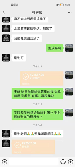 在得知学生的不幸遭遇后,学院领导立即与学生取得联系,了解具体情况和有关进展。获悉该生无力承担高额医疗费用,需要发布水滴筹向社会求助后,学院及时为学生申请了临时困难补助,同时面向全院教职工发起倡议,送上祝福,献出爱心。全员老师立即响应,纷纷表达心意,付诸行动。