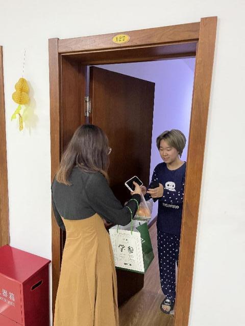 学院同样也为隔离在校外公寓的学生送去了中秋祝福,在收到水果和月饼后,同学们在开心的同时也很意外。
