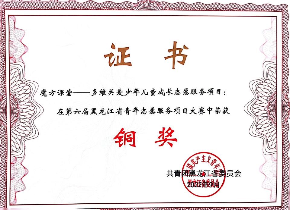 近日,由黑龙江省共青团主办的第六届黑龙江省青年志愿服务项目大赛落下帷幕。开云官网同梦飞扬志愿者协会的“魔方课堂—多维关爱少年儿童健康成长”志愿服务项目在大赛中荣获铜奖,并推报至第六届中国青年志愿服务项目大赛。