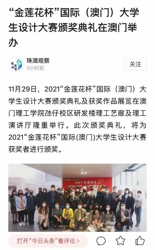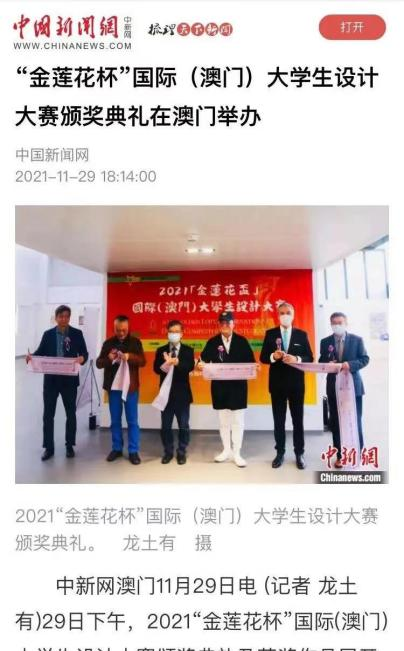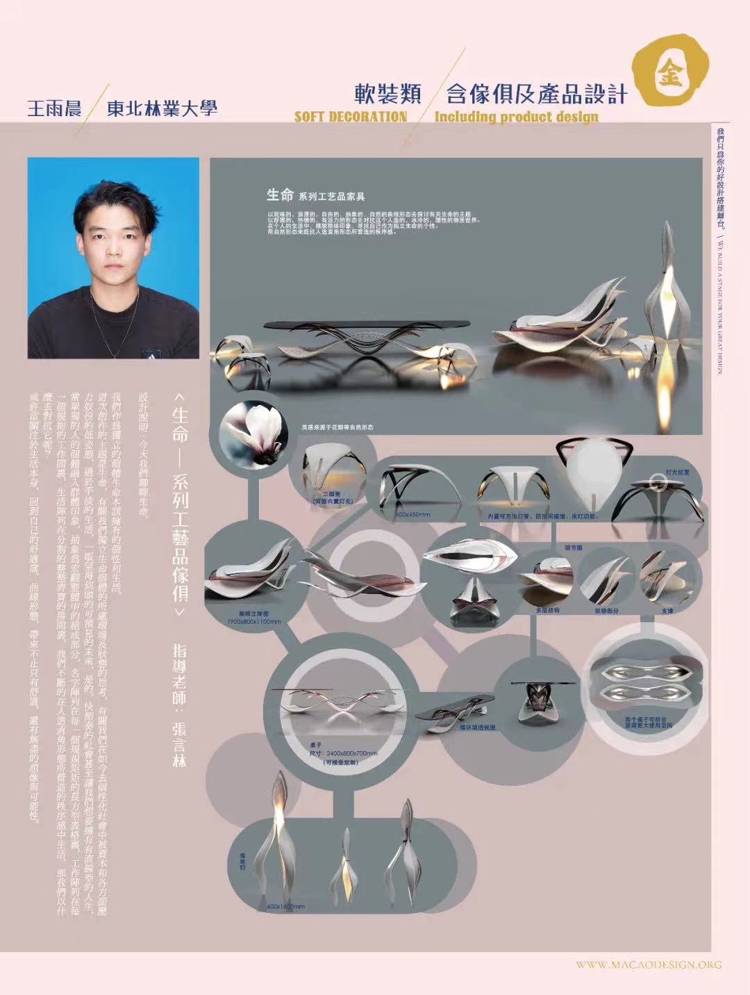 11月29日,由澳门国际设计联合会(Union for International Design of Macao)举办的2021“金莲花杯”国际(澳门)大学生设计大赛颁奖典礼及获奖作品展开幕式在澳门理工学院氹仔校区理工演讲厅及理工艺廊举行。由开云官网工业设计专业张言林教师指导,2019级工业设计专业王雨晨同学设计的作品《生命系列工艺品家具》,经过大赛评委层层筛选,最终拔得头筹,获得2021「金莲花杯」国际(澳门)大学生设计大赛软装类金奖,清华大学获得建筑类金奖,广州华商学院获得室内空间类金奖。