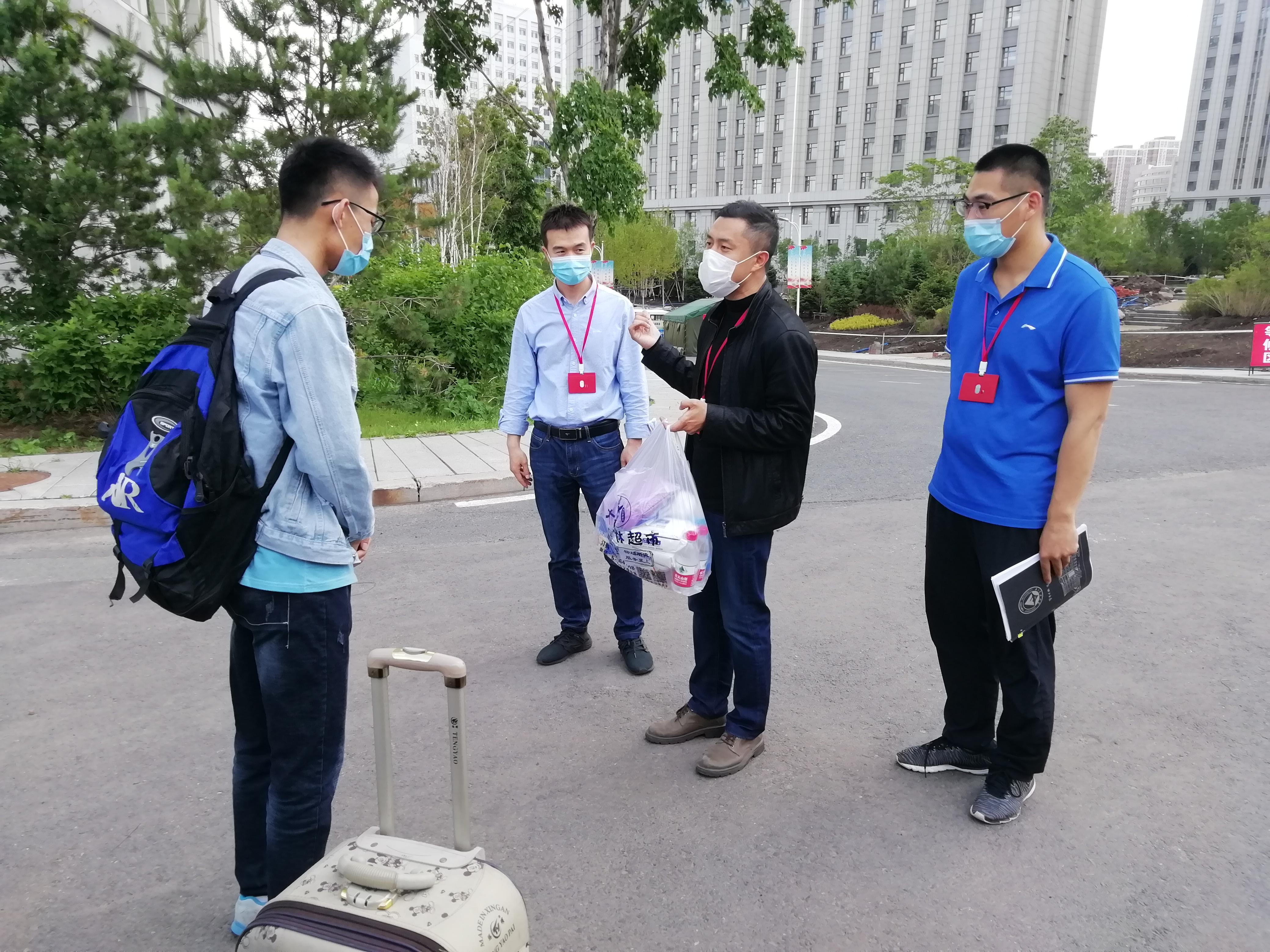 天公作美,雨后放晴。久违的校园、就位的校园做好了一切准备,等候归来的学子。在学生临行前,学院院长刘九庆、党委书记王佳彤与学生逐一通电话,叮嘱安全,了解行程,同时通过“飞常准”APP关注返校学生乘坐的航班动态。研究生导师李兴东、辅导员宁礼佳利用微信群、QQ群与学生即时交互信息。当学生走下班车步入校园大门后,早已在现场等候的学院领导、导师、辅导员与学生挥手致意,互相打气并合影留念,护送学生进入指定隔离地点。随着最后一名学生张时雨入住隔离寝室,学院首批返校的5名研究生全部到位。“回家”后的学生放下了沉重的行李,也让家长、师长、学院和学校放下了惦记。