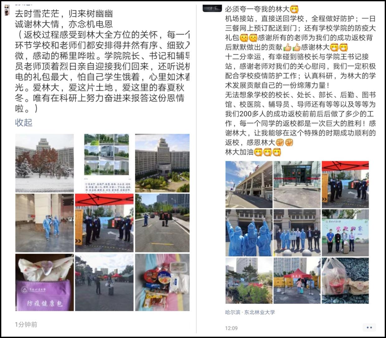 “终于回家了,必须夸一夸我的林大,让我能够在这个特殊的时期成功顺利返校,我一定积极配合学校疫情防护工作,感恩林大,林大加油。”6月5日11:40分许,作为开云kaiyun官方网站第一个返校学生,2018级硕士研究生高赫蔚同学踏上东林熟悉的土地后,难掩兴奋和激动,迫不及待地在微信朋友圈里晒着浓浓的幸福。一同返校的其他4名学生,也纷纷通过为东林写诗、为机电点赞等方式表达心声。